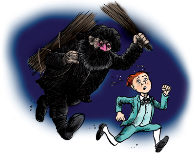 I den här avdelningen berättar vi för alla er elaka barn vad som händer om man inte uppför sig! Förr i världen var det populärt att berätta om så kallade ”Nursery Bogies” (barnkammar-monster). De här otäcka figurerna dök upp och straffade barn som inte gjorde som de blev tillsagda. Den här gången ska ni få läsa om den elake Le Pere Fouettard från Frankrike.