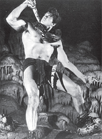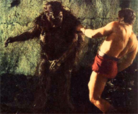 Apmonster mot hjälte i Maciste e la regina de Samar. |