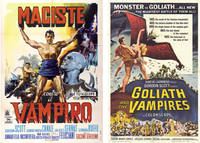 Muskelknutten Gordon Scott blev känd som Tarzan i slutet av 1950-talet och blev därför inhyrd för att gestalta Maciste i två italienska filmer, båda från 1961. Den mest kända av dessa är Maciste contra il Vampiro / Maciste mot vampyren (i USA Goliath and the Vampires), som är en färgstark blandning av saga och skräck. Macistes by blir i filmen ödelagd. Hans mor dödas och hans fästmö blir bortförd. Hennes kidnappare visar sig vara pirater som lyder under vampyren Korbrak, ett monster som har en hel stad och dess sultan-härskare i sitt våld. Korbrak skickar ut piraterna för att fånga in människor som vampyren sedan förvandlar till ansiktslösa slavar i hans tjänst. För att underhålla sin blodtörst utsätter Korbrak stadsborna för diverse grymma lekar som ofta slutar med att deltagarna spetsas eller krossas. Allt det där får givetvis ett abrupt slut när Maciste dyker upp och slår sönder allt inom synhåll med något som liknar en telefonstolpe. Så småningom får han också hjälp av en ras av blå män som bor i underjorden och är vampyrens svurna fiender. När Maciste till slut lyckas ta sig in i vampyrens näste förvandlar sig Korbrak till en kopia av hjälten och de bägge inleder en vild brottningsmatch. Under tiden hotas hjältinnan av att bli uppäten av en sorts krabblika spindelmonster i en djup grop. Men alla monster får så klart stryka på foten, de ansiktslösa slavarna blir vanliga människor igen och Maciste återförenas med sin älskade.