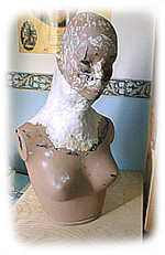 Du behöver skaffa en stadig stomme att skulptera på. En gammal skyltdocka är helt perfekt. På just den här har den tunna halsen förstärkts med en riktig tjurnacke av plastillina-lera.